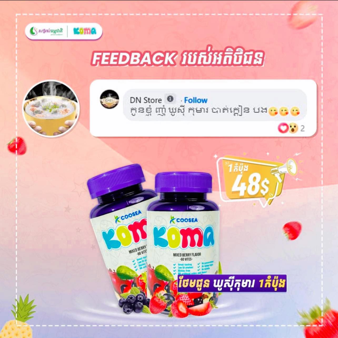 សំរាប់ម៉ាក់ប៉ាដែលមានកូនមិនសូវញ៉ាំបាយ ស្លេកស្លាំង ទល់លាមក រើសចំណី អោយសាកញាំឃូស៊ីកុមារ (Coosea Koma) គឺនឹងឃើញប្លែក លែងក្តៀន ញាំច្រើនជាងមុន រហ័សរហួន សាច់ឈាមស្រស់ថ្លា ស្បែកស្អាត សក់ ក្រចកលូតលាស់ល្អ ខួរក្បាលរហ័សរហួនកម្លាំងកាយមាំទាំ។